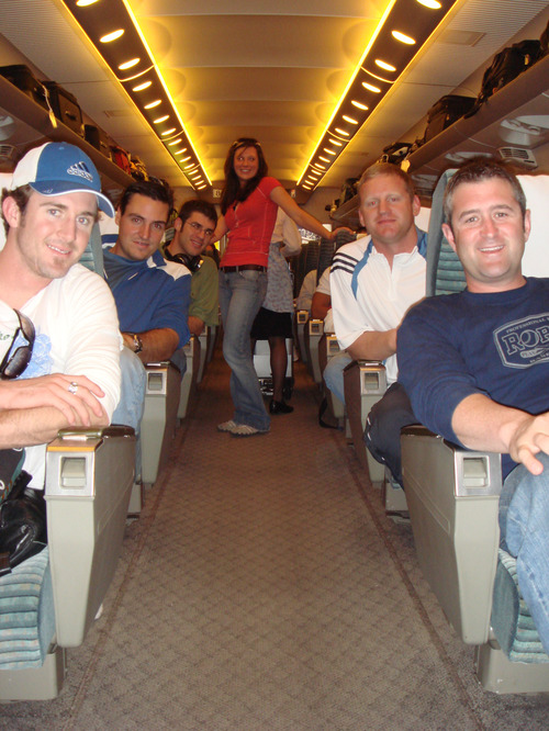 Joe Mauer, Lyle Overbay, Chase Utely, Brian Schneider, myself and Sarah Overbay on the bullet train from Tokyo to Kyoto.